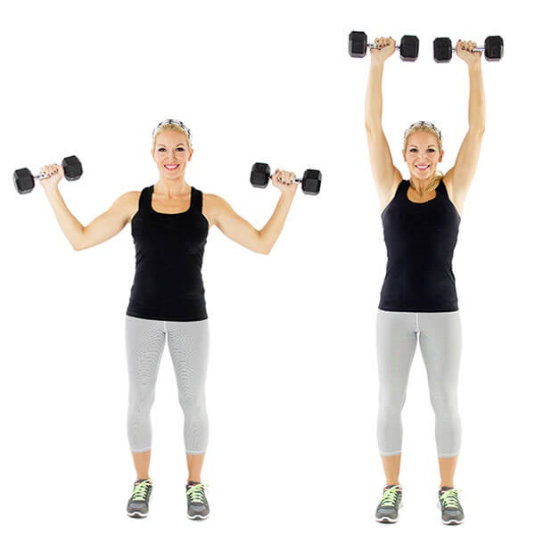 - Cùng lúc này bạn đẩy hai quả tạ lên trên thẳng đứng qua đầu sau đó bạn hạ tạ xuống và hãy lặp lại toàn bộ động tác.