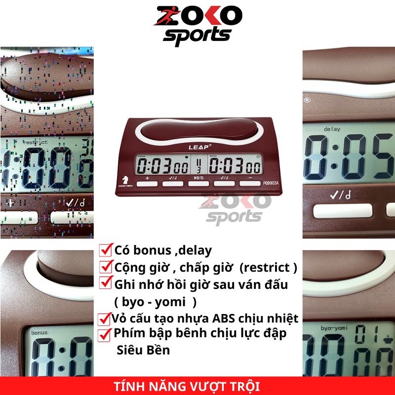 - Đồng hồ thi đấu cờ vua LEAP PQ9903 được thiết kế nhỏ gọn, bền đẹp và đo thời gian cực kỳ chính xác. PQ9903 dễ dàng sử dụng với 38 nấc mặc định (Countdown, Bonus,...) và đặc biệt nấc "00" thỏa thích cài đặt giờ chơi theo mong muốn của người chơi cờ.