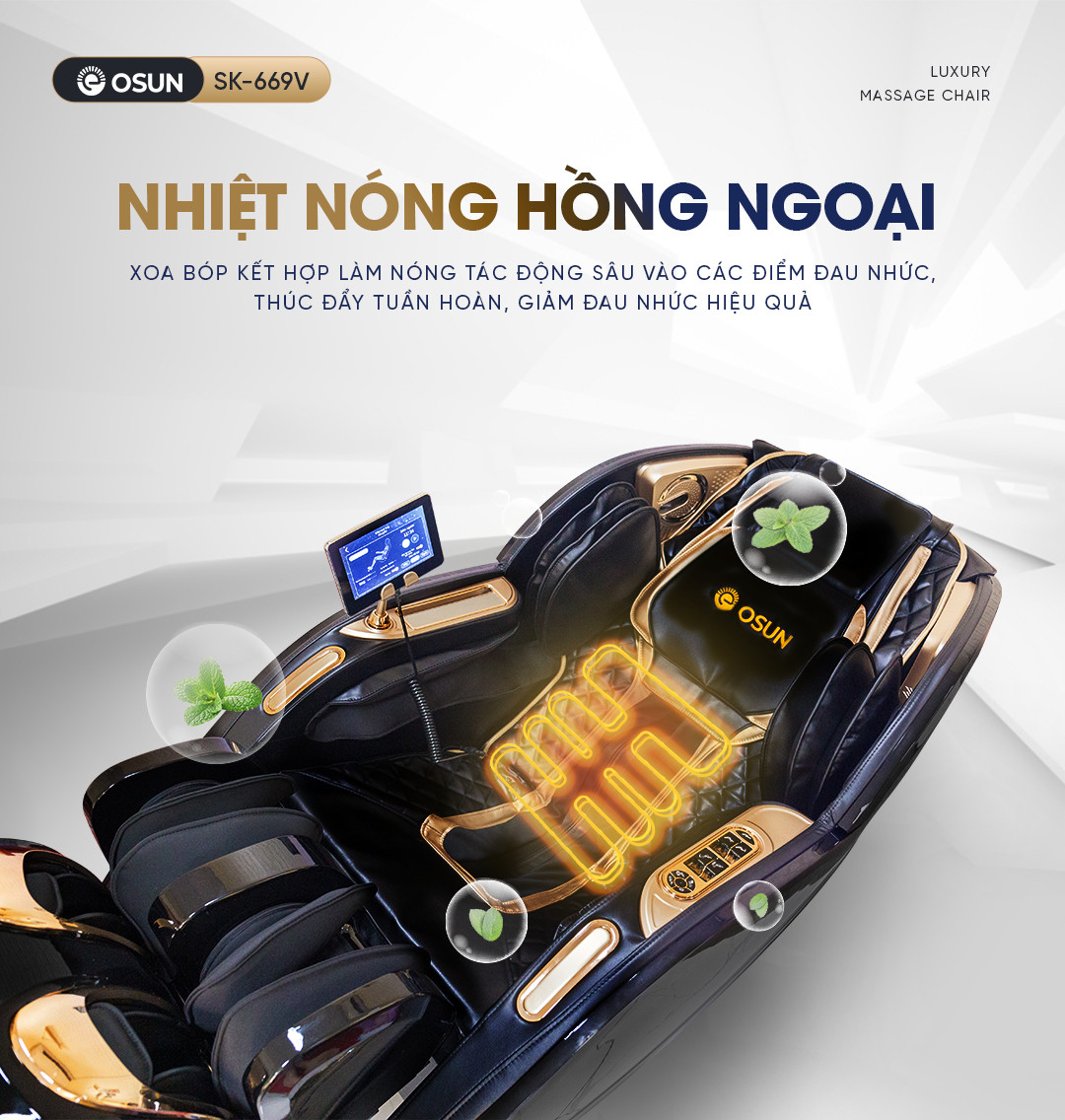 Hệ thống nhiệt nóng của OSUN SK-669V được đặt tại vùng eo tạo ra khả năng trị liệu tối ưu. Nhiệt cũng có tác dụng làm ấm cơ thể vào mùa đông và làm giãn tĩnh mạch để tuần hoàn máu được tốt hơn nhờ đó đảm bảo cung cấp oxy với chất dinh dưỡng tới từng mô trong cơ thể. Ngoài ra, nhiệt nóng cũng giúp bấm huyệt từ con lăn giảm đau hiệu quả.