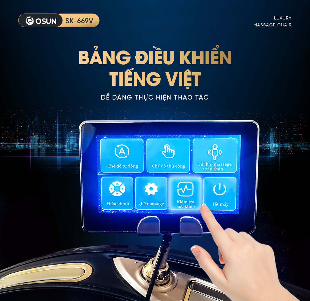 Với ghế OSUN SK-669V người dùng cũng có thể chủ động trong việc chăm sóc sức khỏe. Các bộ phần từ mông, lưng, eo, bàn chân, tới bắp chân, vai, đầu tay đều được chăm chút tỉ mỉ. Việc điều khiển sẽ trở nên đơn giản hơn với màn hình cảm ứng có sử dụng ngôn ngữ Tiếng Việt cùng hệ thống AI điều khiển được bằng giọng nói. Sản phẩm được thiết lập nhằm cung cấp cho người ngồi trên ghế với chỉ số sức khỏe như là nồng độ oxy trong máu, nhịp tim...