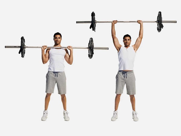 - Bạn hãy giữ hai cổ tay thật thẳng đẩy tạ lên và hơi nghiêng về phía sau sao cho khi lên hết mức thanh tạ ở trên hai vai.