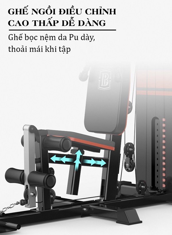 Bộ phận ghế ngồi, ghế tựa lưng và bàn tập tay trước được bọc nệm da PU cực dày, êm nhằm tạo cảm giác thoải mái nhất cho người tập. Ghế ngồi tập có chức năng điều chỉnh cao thấp hay tiến lùi để phù hợp cho mọi đối tượng.