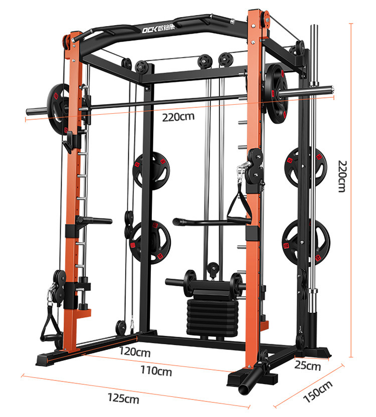 + Đòn tạ Squat đi kèm có chiều dài là 2m2, với thiết kế chạy dọc theo hay bên khung gánh, và có móc để đảm bảo an toàn trong lúc tập. Ở đòn tạ có lắp bánh tạ phi 30 hoặc phi 52.