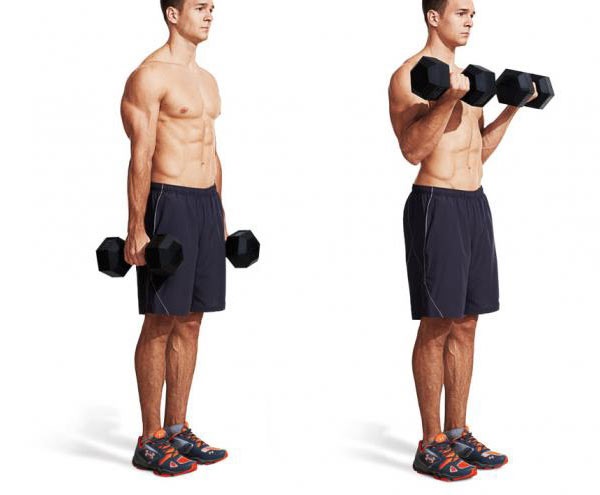 - Ban đầu bạn đứng thẳng, hai tay cầm tạ và giữ nó ngang với đùi của mình. Lòng bàn tay của bạn hướng vào nhau.
