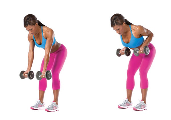 - Tư thế ban đầu đứng thẳng, hai chân rộng hơn vai, hai tay cầm tạ giữ ở giữa phía trước người.