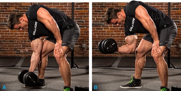 - Ban đầu bạn hãy giữ tạ bằng một tay, đẩy người về phía trước sao cho lưng song song cùng với sàn. Đặt tay kia của bạn lên đầu gối.